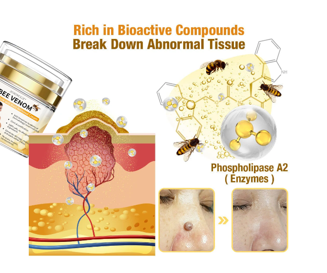 Bee venom contains a variety of bioactive compounds, including melittin, melittin and adolapine, which have been scientifically proven to be effective in treating skin tags or warts, and among its many enzymes, phospholipase A2 stands out for its ability to break down abnormal tissue, simplifying the removal process of skin tags or warts.